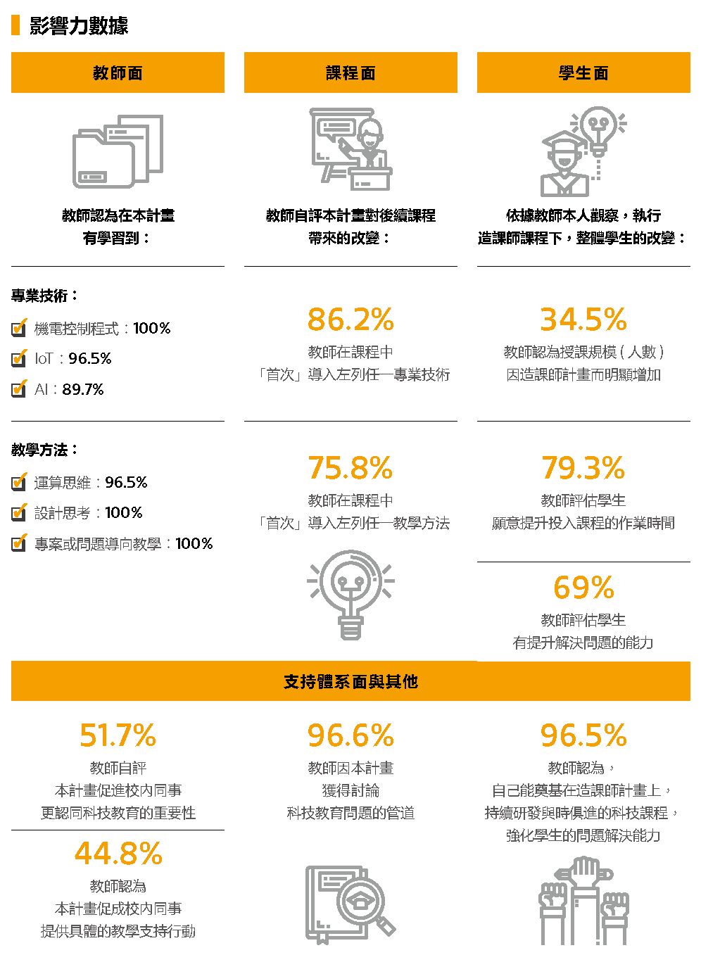 從上述已走完兩年的第一屆造課師的影響力數據調查顯示,九成以上教師認同在本計畫中有學習到新的科技技術或教學方法;約七至八成有實際導入教學中;約六至七成有觀察到學生在學習動機與問題解決能力有所進步;值得關注的是,PBL 導向教學元素導入的難度更勝於純技術的導入。